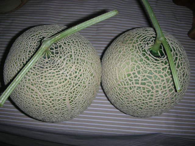 写真のメロン!Yさんから頂きました(*^。^*)やりますねえ、すごい栽培!「食べごろは?」って聞いたら返事は愉快でした。御馳走様です。