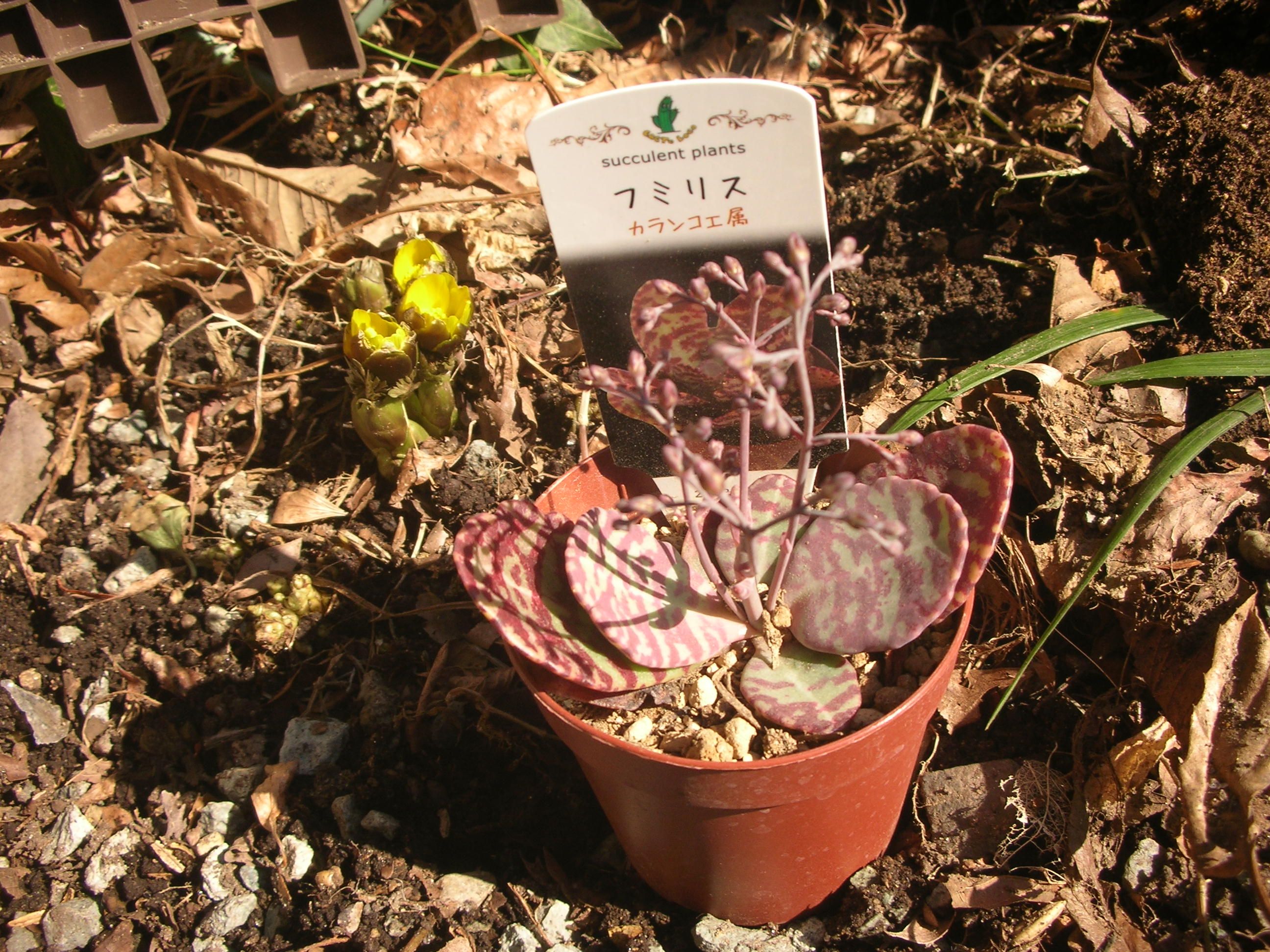 な我が家。昨日金成ホーマックの園芸の売り場みたら、、、、えっこれ見たことない!多肉が!多肉好きの虫が動いて買いました。あれ 入口には福寿草が