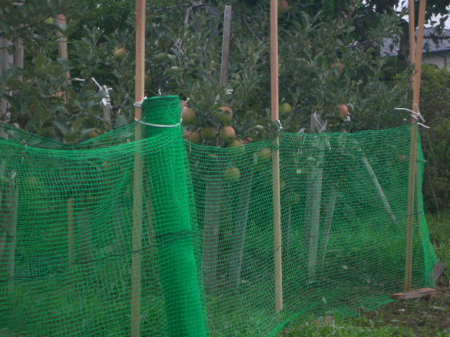 育ってきたりんご(*^。^*)食べごろがわかるのでしょうね、タヌキさん!届く下の方から食べてます。そこで網を張って防いだのですが、、、、、。網をしていない木のりんごをたべたそうです。