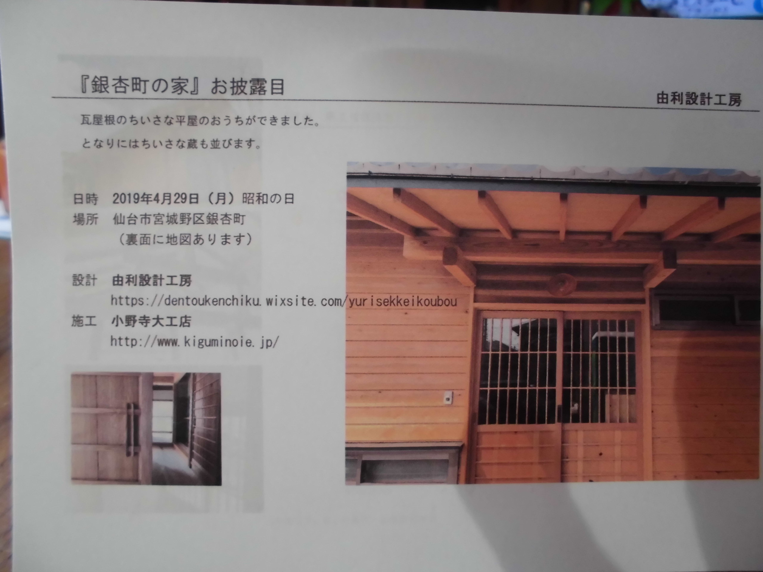 建具工事にかかわらせて頂きました、「銀杏町の家」のお披露目の案内もらいました。4月29日昭和の日で、皆様にも是非!ご覧いただきたいなあと