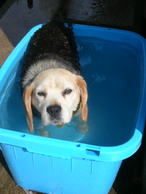 暑くて暑くて大変なのは、ドロシー君も同じ!散歩から帰って来てまずはプールへ入って、ウットリ\(^o^)/自分で入ったり出たりできますよ!