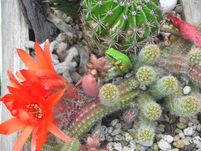 越冬した私の多肉植物たち\(^o^)/花が咲いたのでみたら、かえるちゃんが!サボテンの上に!痛くないのかなあ。。。きょうで6月も終わり、半年終わりましたね。。。